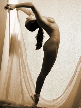 Обув на ножки бежевые балетки, а на ножки натянув синие облегающие лосины, стройная чувиха с милым лицом подошла к роскошному диванчику и принялась принимать сложные позы, показывая свою гибкость. После разминки балерина окончательно оголилась и стала хвастаться уже не только растяжкой и титьками. но и ухоженной пилоткой.