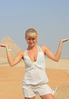 Приехав в страну фараонов, сексуальна блонда решила побывать на нудистских пляжах и пошла их искать. Найдя таковые, красавица первое время стеснялась снять с себя черный купальник, но потом вошла во вкус и уже спокойно плескалась в воде и загорала полностью обнаженной. Девушке так понравилось ходить голой, что даже в номере она не одевалась.