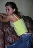 Большеглазая молодка с волосатыми руками зашла на кухню и присела на небольшой диванчик, на котором у нее и появилось желание снять с себя желтую майку. Вслед за ней последовали и синие джинсы, под которыми были белые трусики с розовым узором. Прекрасная обольстительница через короткое время осталась на кухне голая, в одних носках.