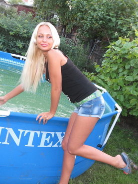 Бикса с объемными волосами вышла на задний двор в белом комплекте нижнего белья и начала купаться в бассейне. Вскоре дама решила что голышом ей будет лучше и поэтому все с себя сняла, обнажив титьки и волосатую писю с большим клитором. На следующий день сучка вернулась сюда же, но только теперь она была с бритой писюшкой.