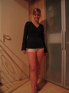 Придя к себе домой, улыбчивая блондиночка разделась догола и стала валяться на кровати, показывая свою писечку и молочные железы. Лежать без трусов и лифчика представительнице прекрасного пола было не комфортно, поэтому она надела на себя нижнее белье и продолжила отдыхать, параллельно соблазняя сожителя периодической демонстрацией прелестей.