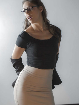 Аппетитная цыпочка в красной одежде стала в углу просторной комнаты и там начала позировать, постепенно снимая с себя юбку и блузку. Когда грешница осталась лишь в нижнем белье леопардового цвета, она взяла свой любимый самотык и принялась удовлетворять себя. Чуть позже дама оставила на себе только бежевые чулки и сидя на полу продолжила трахать себя секс игрушкой.