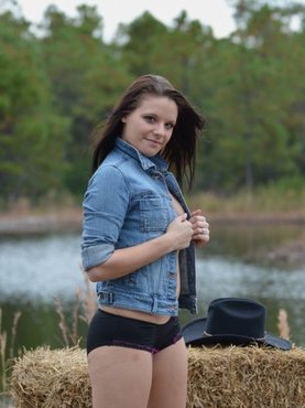 Сексуальная стройняшка с идеальной фигурой на черном автомобиле заехала в пустыню и там сняла с себя все кожаную куртку вместе с грязными штанами. Оставшись лишь в аксессуарах и черной шляпе, сногсшибательная красавица начала показывать во всей красе аккуратные сиси вместе с хорошо депилированным лобком.