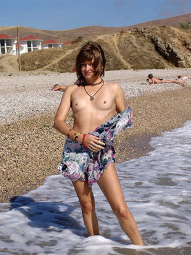 Миловидная девушка пришла с парнем на берег моря в пасмурную погоду и там позволила ему потрогать ее за сиськи через одежду. Чуть позже рыжая цыпочка присела на корточки и начала делать минет избранника, а еще позже оголила киску и занялась вагинальным сексом, в результате которого получила много приятных ощущений.