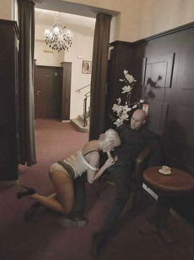 Блондинистая милфа сосет лысому мужчине в комнате с тусклым освещением