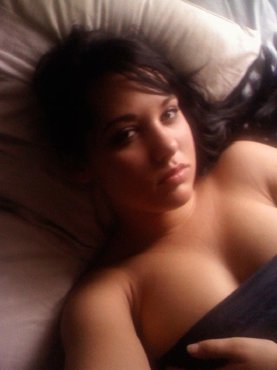 Клевая брюнетка лежит на кровати с голой грудью