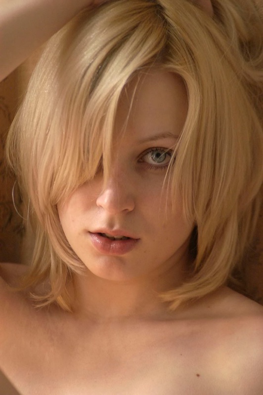 Нагая Оля подошла к комнатному цветку на подоконнике