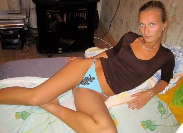 Чертовка уселась на сером диване в белых трусах и лифчике