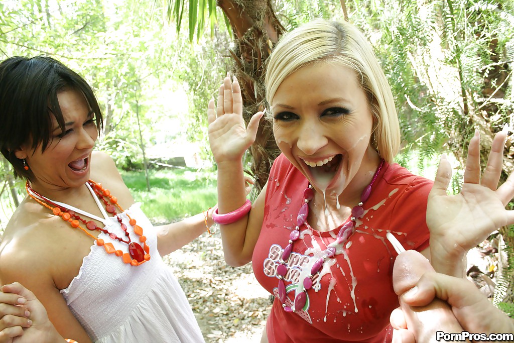 Блонда с накрашенными глазами делится с брюнеткой обилием спермы