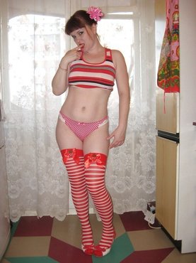 Полосатые чулки не мешают мамке светить писькой