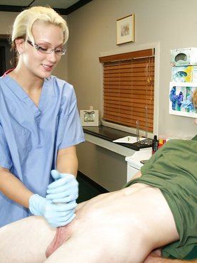 Медсестра в очках дрочит рыжему пациенту сидящему на кресле