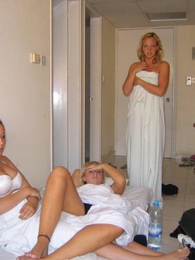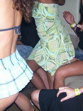 Пьяные телки на вечеринке оголяют сиськи ложась на стол